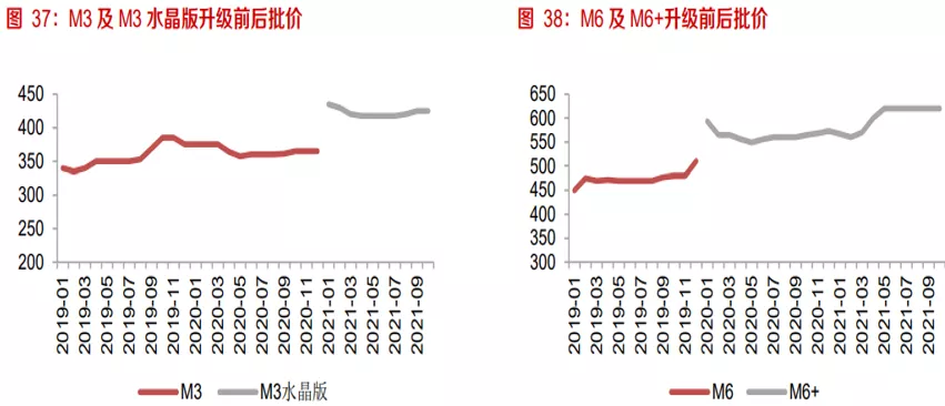 品牌升級帶來的最直接影響就是提價。M3+和M6+體現十分明顯。東方證券數據顯示,M3升級為水晶版後,批價由360元左右提升至420元左右,增長了大約17%;M6+批價則由475元左右提升至620元附近,增長了約30%。