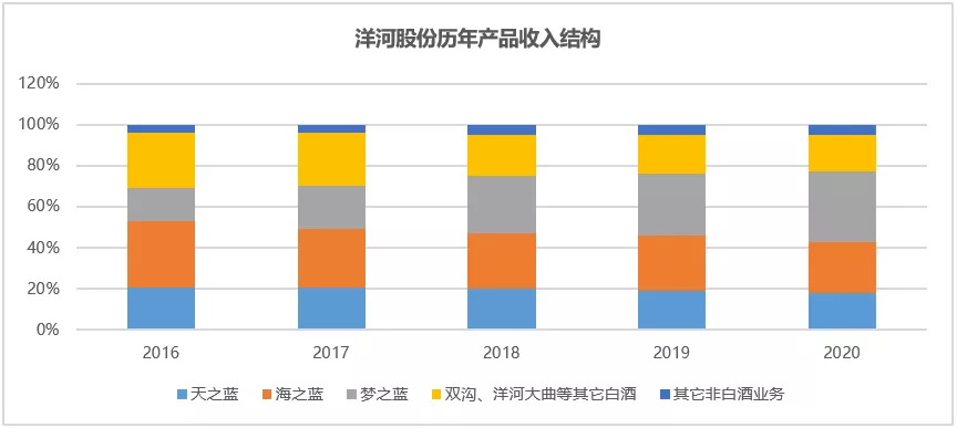 當前洋河主要有洋河和雙溝兩大戰略品牌。洋河系列包括藍色經典、微分子和洋河大麴等,雙溝主要包括珍寶坊和蘇酒系列,蘇酒系列包括綠蘇和頭排酒等。