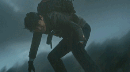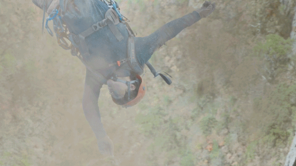 滾落的巨石間,她一記乾脆利落的繩降,從山上迅速飛落。
