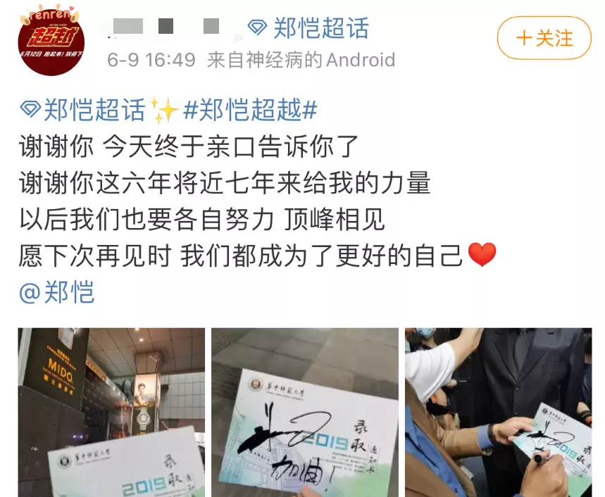 兩年後,這位粉絲,帶着錄取通知書去找鄭愷簽名。