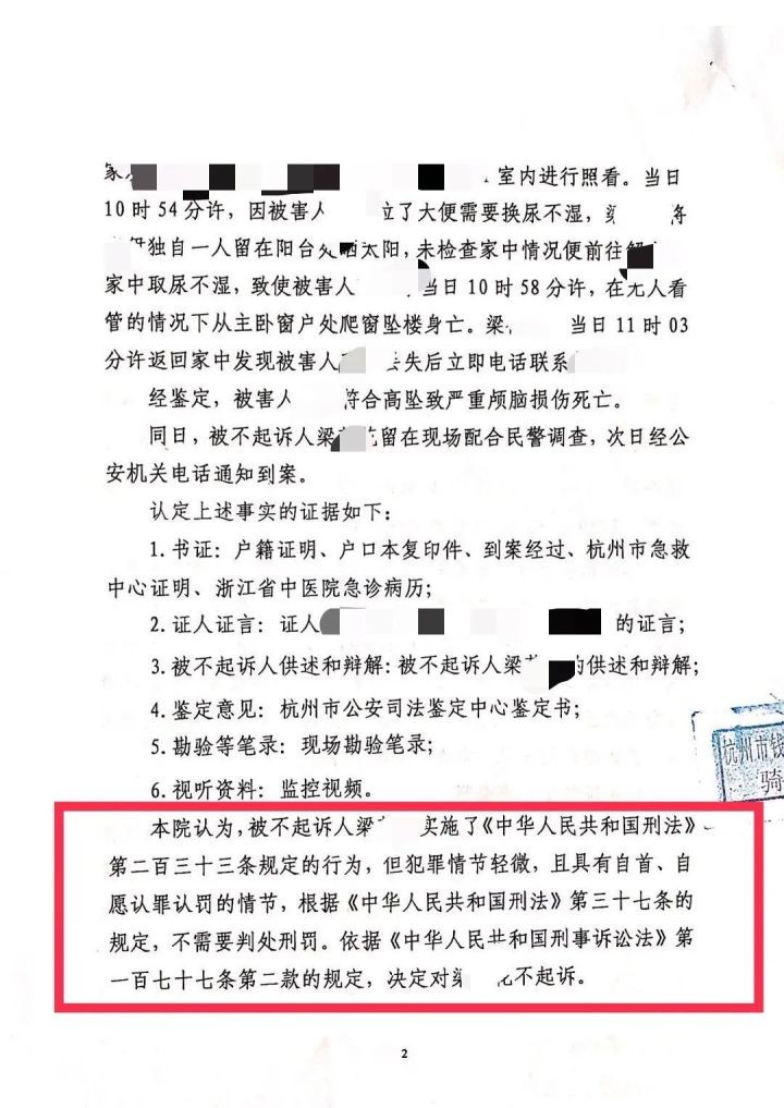 《杭州市錢塘區人民檢察院不起訴決定書》。受訪者供圖2021年10月26日,檢察院對保姆梁某花作出不起訴決定。 據解女士提供的“杭州市錢塘區人民檢察院不起訴決定書”顯示,錢塘區人民檢察院審查查明,事發當日,保姆將寶寶獨自留在陽台處曬太陽,未檢查家中情況便前往解女士家取尿不濕,致使寶寶在無人看管的情況下從主卧窗户爬窗墜樓身亡。 檢察院審查認為,被不起訴人梁某花犯罪情節輕微,且具有自首、自願認罪認罰的情節,根據《中華人民共和國刑法》第三十七條的規定,不需要判處刑罰。依據《中華人民共和國刑事訴訟法》第一百七十七條第二款的規定,決定對梁某花不起訴。家長:已向上級檢察院提出申訴“保姆在工作時間把寶寶帶離我的家去她女兒家幫忙,存在嚴重的失職和過失。在知道自己女兒家的玻璃沒有防護措施的情況下,還把我女兒一個人反鎖在家,才導致了悲劇發生。”解女士認為,保姆應該在該事件中承擔責任,她無法接受檢察院不起訴的決定。 解女士告訴記者,保姆梁某花被取保候審後,她的家人沒有再上門聯繫過。而此事民事賠償方面,解女士表示因為精力有限,暫未提起。 11月2日,解女士就此事向杭州市人民檢察院申訴。解女士告訴記者,她希望能夠給孩子一個説法,讓孩子入土為安。來源於:旺旺屋