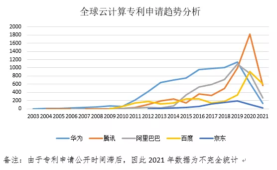 圖:中國雲計算大廠全球專利申請趨勢。來源:知產寶數據研究中心
