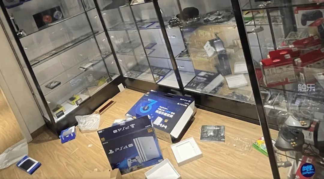 從2015年到現在,極客堂一直風平浪靜地經營着,直到6月18日發生那起盜竊案。那天早上,店員上班的時候被保安告知,門口的招牌被人踩斷了。到了二樓一看,現場一片狼籍,玻璃展櫃大開,到處是被拆掉的包裝盒,不少主機和主機配件不翼而飛。