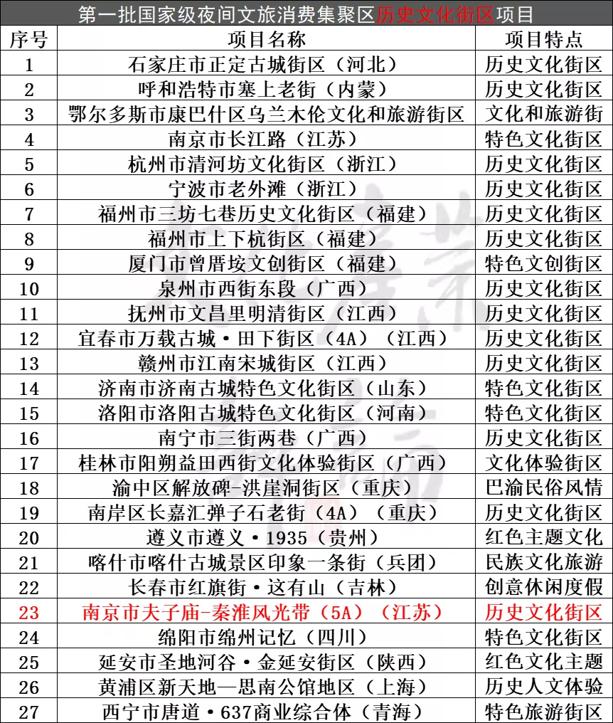 在首批入選的120個國家級夜間文化和旅遊消費集聚區項目中,涉及歷史文化街區、特色文化街區、主題文化街區等集聚區共有27個,佔總項目數的22.5%,是各類項目中入選數量最多的消費集聚模式。