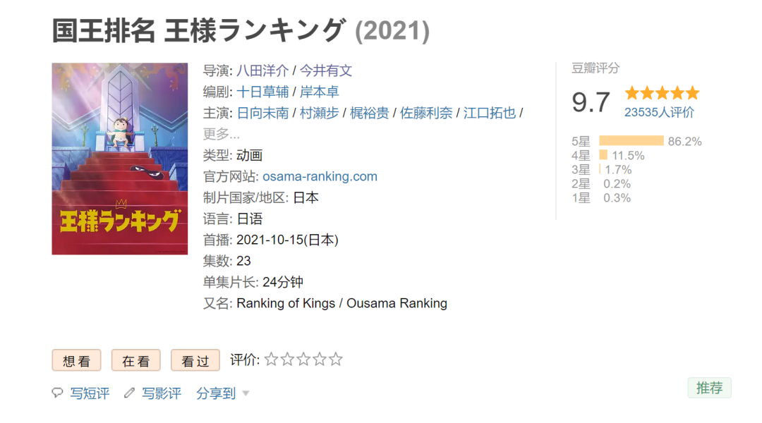 它就是近期洗版各大媒體頭條,在B站、豆瓣等斬獲超高人氣的**《國王排名》**。當然評分僅是一個參考,但也從側面反映出很多人和筆者一樣對這部作品非常喜愛,甚至迫不及待地想向周圍所有人安利一番。