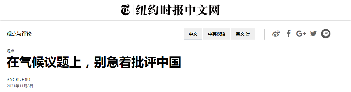 文章提到中國在聯合國氣候峯會等國際場合強調“歷史排放總量責任”一事,並試圖為西方開脱,宣稱中國的角色現在已經轉變了,“有關歷史排放總量的指責不再有説服力”。