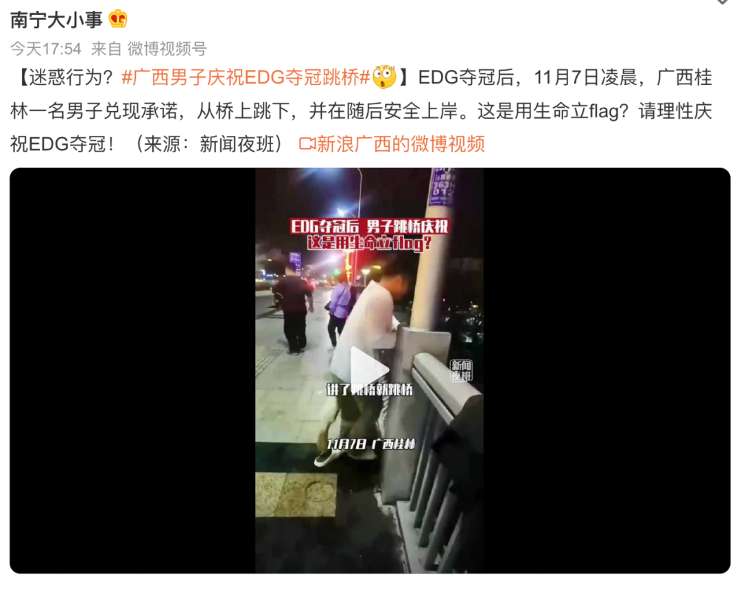 “有人黑夜上街裸奔裸舞,有人集體長期喧譁尖叫,甚至還有人做出危及生命的極端行為……這樣的影像畫面在網絡上大肆傳播,傳遞的並不是奪冠的榮耀,勝利的驕傲,更無益於宣揚電競精神,形成大眾共識,反而是給電競抹黑。”一位電競愛好者向文娛價值官表示。一方面,他為EDG奪冠引發的全民討論而激動,另一方面卻痛心疾首於部分網友藉機鬧事的腦殘行為。