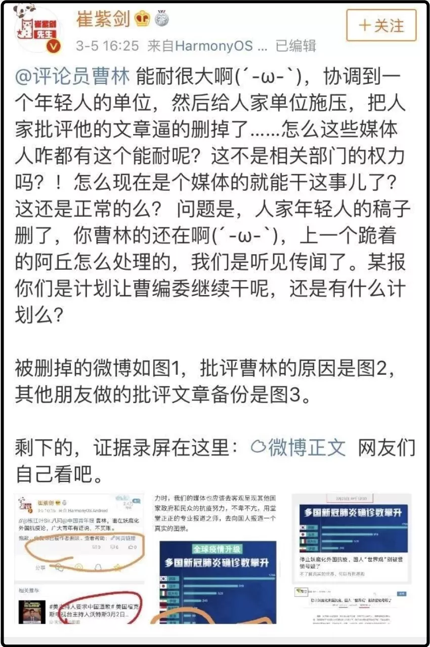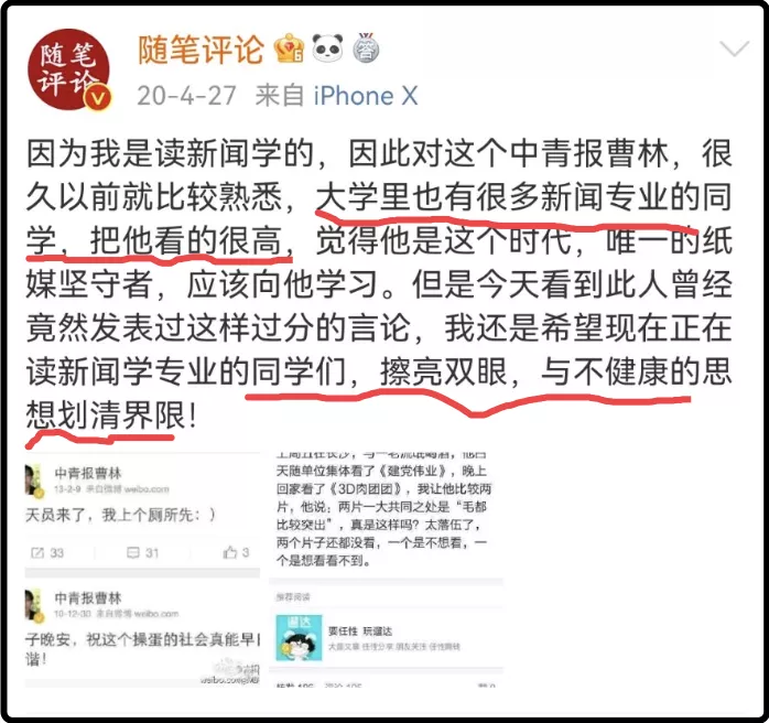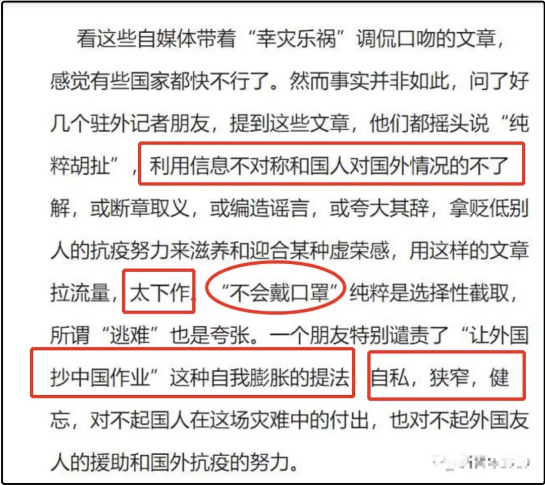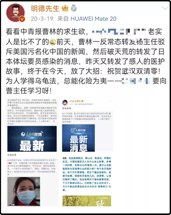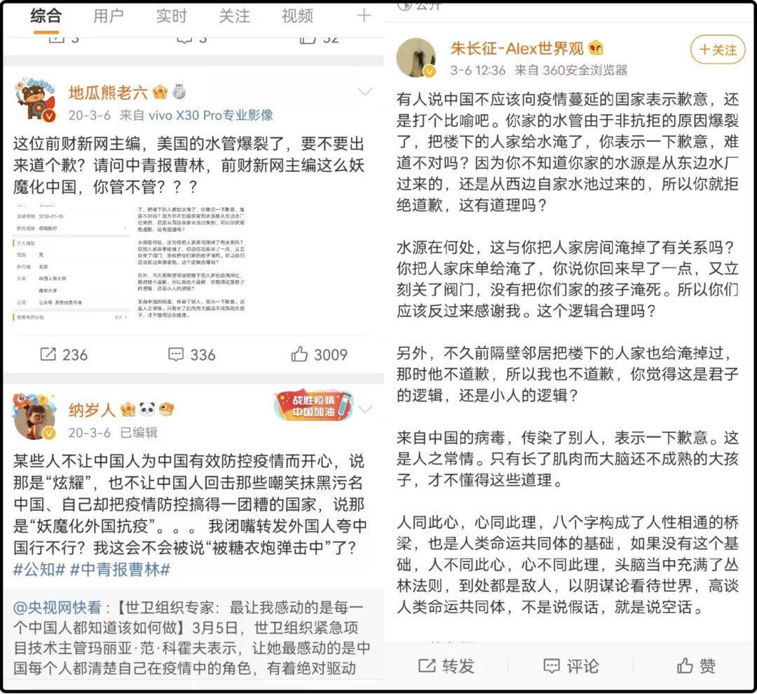 然而,讓人萬萬沒想到的是,一些個別的“老鼠屎”竄了出來——有發通稿肯定英國和瑞典提出的“羣體免疫”觀點的某聯生活週刊,有和知名媒體人阿丘一起自行代表中國人向世界道歉的“獨立思考人士”,還有撰文反污國內媒體**“妖魔化西方”**的某青報資深媒體人曹某。