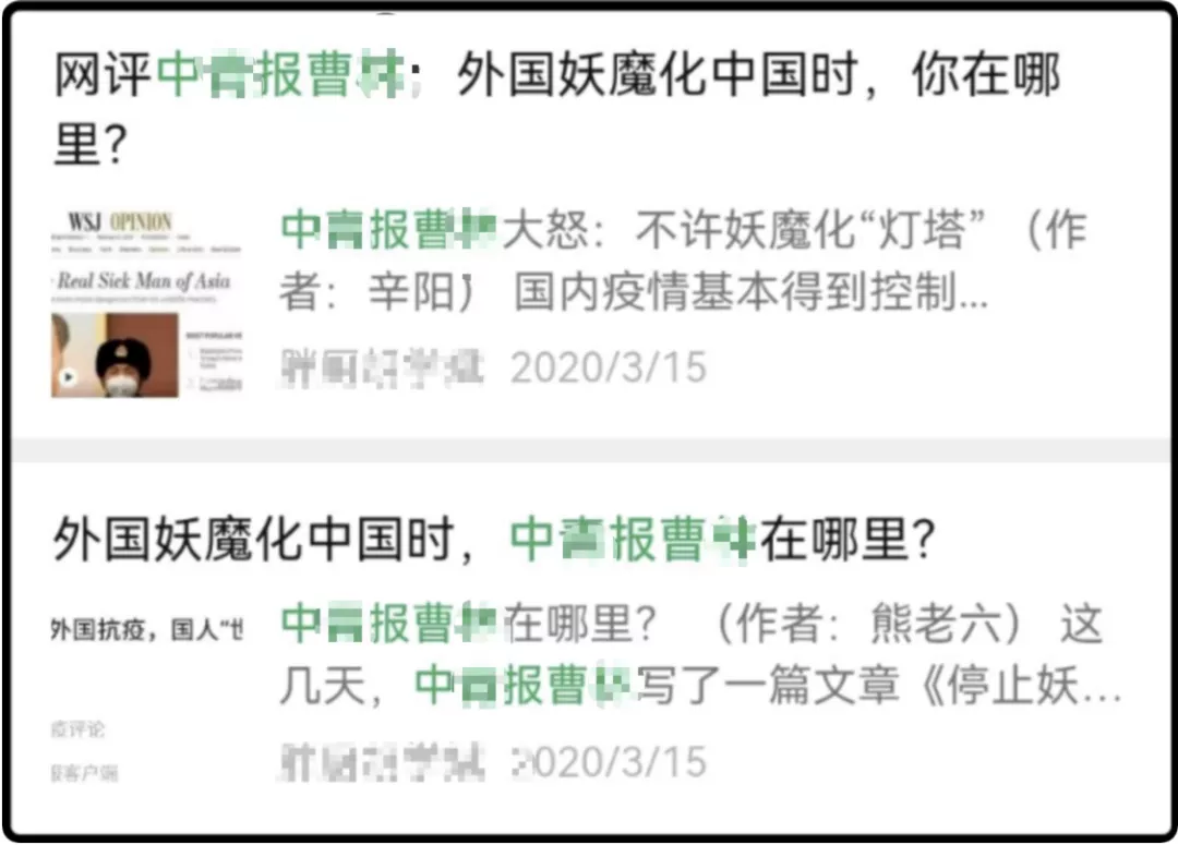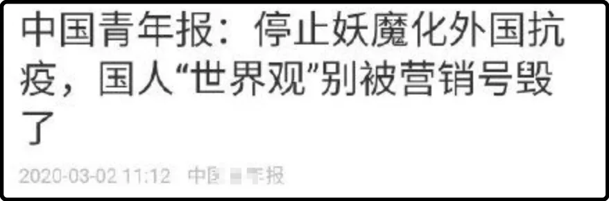 在曹某的主持下,某青報系在當時外交系統、輿論系統全力反擊西方造謠、污衊的情況下,發表了主題為**“停止妖魔化國外抗疫”**的文章,將中國媒體平台上對西方防疫問題的客觀報道、批評西方政客漠視疫情問題的內容,極具誤導性地打上“妖魔化他人”和“營銷號套路”的標籤。(如今回頭看看真相,大家也一目瞭然了,國內媒體絲毫沒有誇大情況,歐美如今死亡已達數百萬人。)