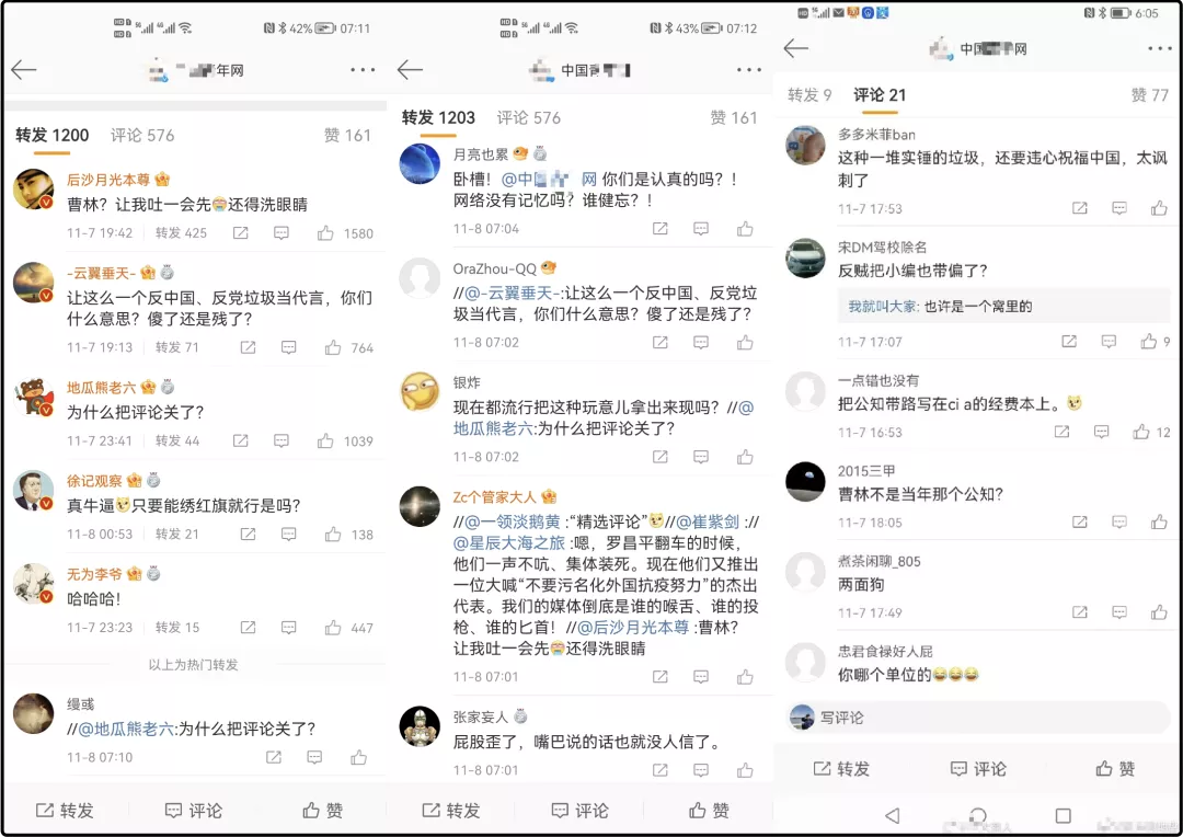 在如此關鍵時期唱反調、給境外反華勢力遞彈藥,曹某及其團隊的行為迅速引發羣眾的憤慨,針對曹某及其團隊的批評聲音也在一夜之間呈爆發性增長。