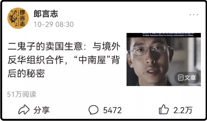 由此,我們也接着聯想到另外三件事:新民週刊小編因為批評了方方造謠,而被高管撤換;2020年底,財新網副主編回首2020年的時候,感慨“過去三十年啓蒙失敗”,滿嘴都是西方式對中國“民智”失望的口吻;2021年10月,在某烈士紀念日前後,@江蘇聯通 運營小編在被羣眾提醒的情況下,執意兩次發佈涉及攻擊英烈的涉謠言內容;被眾多主流媒體捧為“公益良心”的中南屋,於2021年10月被曝光可疑的反華勾當。