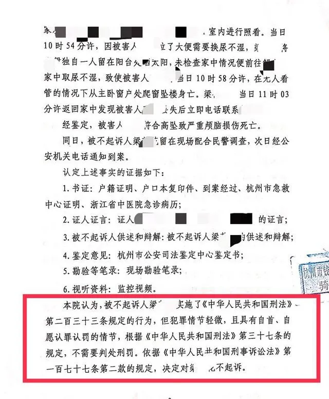 2020年12月15日發生了一起悲劇,一個兩歲的寶寶翻窗從23層的高樓摔下,意外墜亡。有朋友會問,大人上哪了,怎麼不管好小孩子?原來,寶寶本來是有保姆照顧的,但是當時寶寶排了大號,保姆梁某花便將孩子獨自留在陽台曬太陽,到僱主家拿尿不濕,結果就在這期間寶寶從主卧的窗户翻出,不幸墜樓。事發後,杭州市聞潮派出所對此事以過失致人死亡立案偵查。17日,梁某花被刑事拘留。2021年10月26日,杭州市錢塘區檢察院以梁某花犯罪情節輕微,且具有自首、自願認罪認罰的情節,因此做了不起訴的決定。
