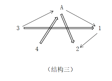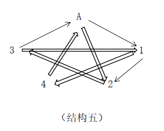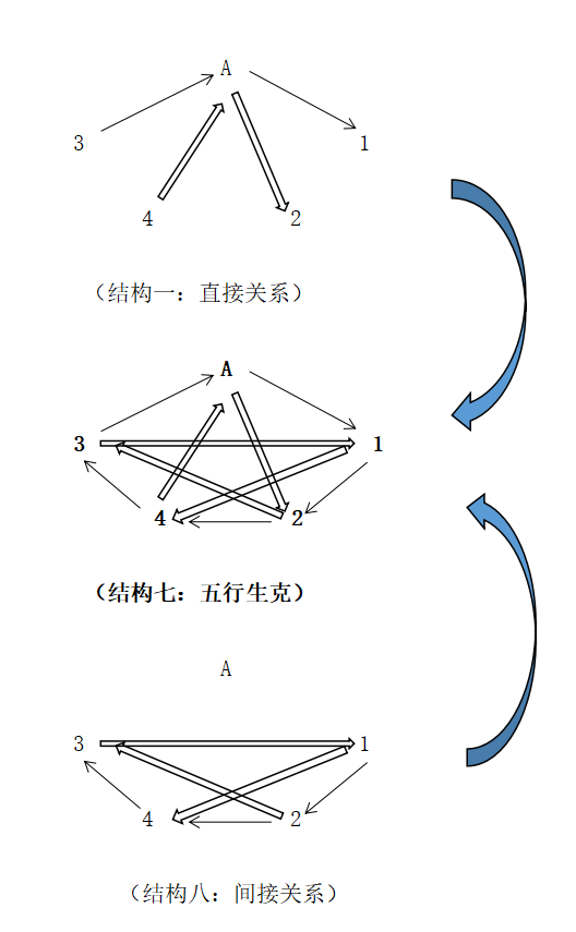這個結構就是“直接關係網”的基礎狀態(客體與主體建立直接關係)。我們把這個結構以五角的樣式表述(同時用符號A代表主體,客體兩字縮略,只保留1、2、3、4,實心箭頭表示生,空心箭頭表示克,箭頭所指為關係中的被動方、次要方;相對的位置就是主動方,主要方):