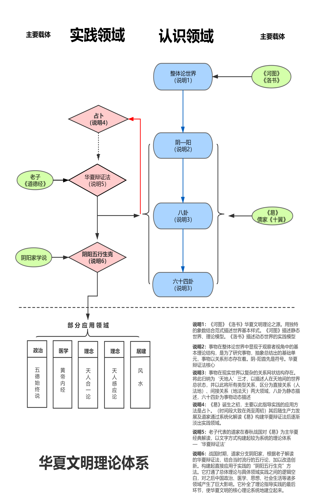 當這種結構確立後,為了套入現實實際事物,必須要做出概念性的解釋,甚至需要列舉相似事物來實際呈現這個結構相互的意義,並以此指導實踐徹底脱離周以前用占卜應用華夏辯證法的方式,而進入完全依靠數理結構和邏輯關係的理論形式來協助實踐更加有效的階段。