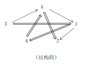1與4的直接關係分析如下:A主導給1帶來利益,4主導損害或拿走A的利益。在這組關係中,1和4作為得利方,為了維持自己利益持久,都必須保證A持久存在,但A在兩個方向付出利益,這是不可持久的。於是這就要求1、4從A所得利益要剋制,但是誰又願意少得呢!於是1與4得利益是對立的。由於是A主導給1帶來利益,即4很難改變A與1的關係狀態,且4作為主導方,A是無法控制被4拿走多少利益的,而1與A的關係處於被動地位,因此從A得利的對比中,1是處於被動弱勢地位。因此為了維持自己的利益,從而要出手維護A的利益(4從A所得)。因此1會更大概率作為主動方,採取措施減少4從A所得。所以組合三的系統中,1與4的關係,是1主導下克4,1克4