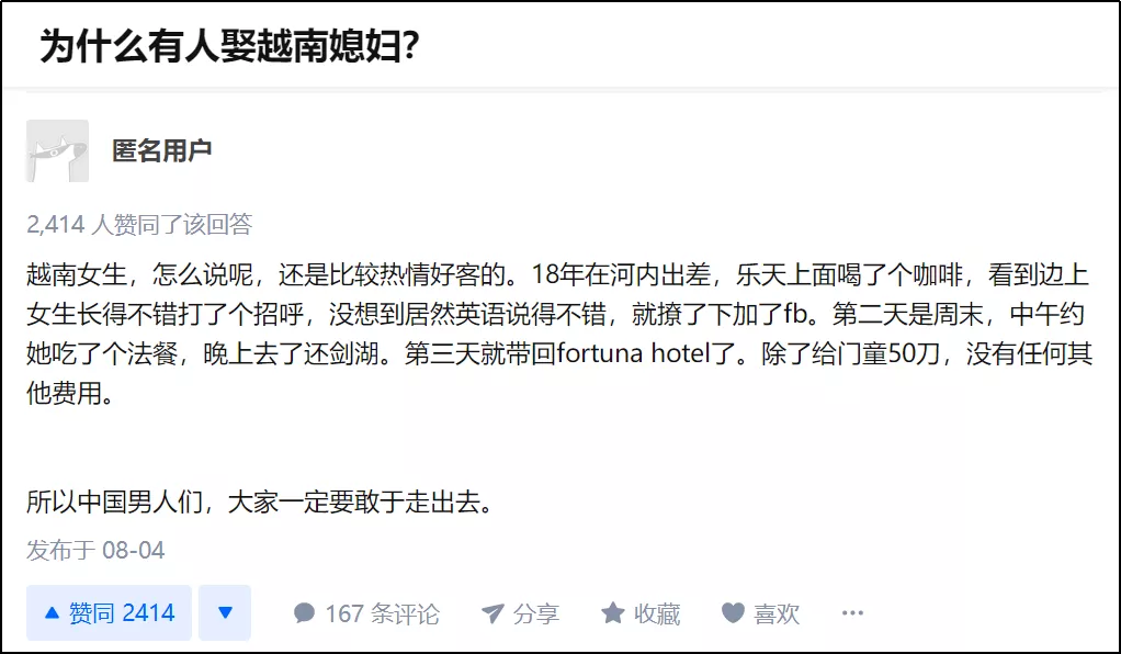 比如,在這些人看來,娶越南媳婦可以嚐嚐處女味道。