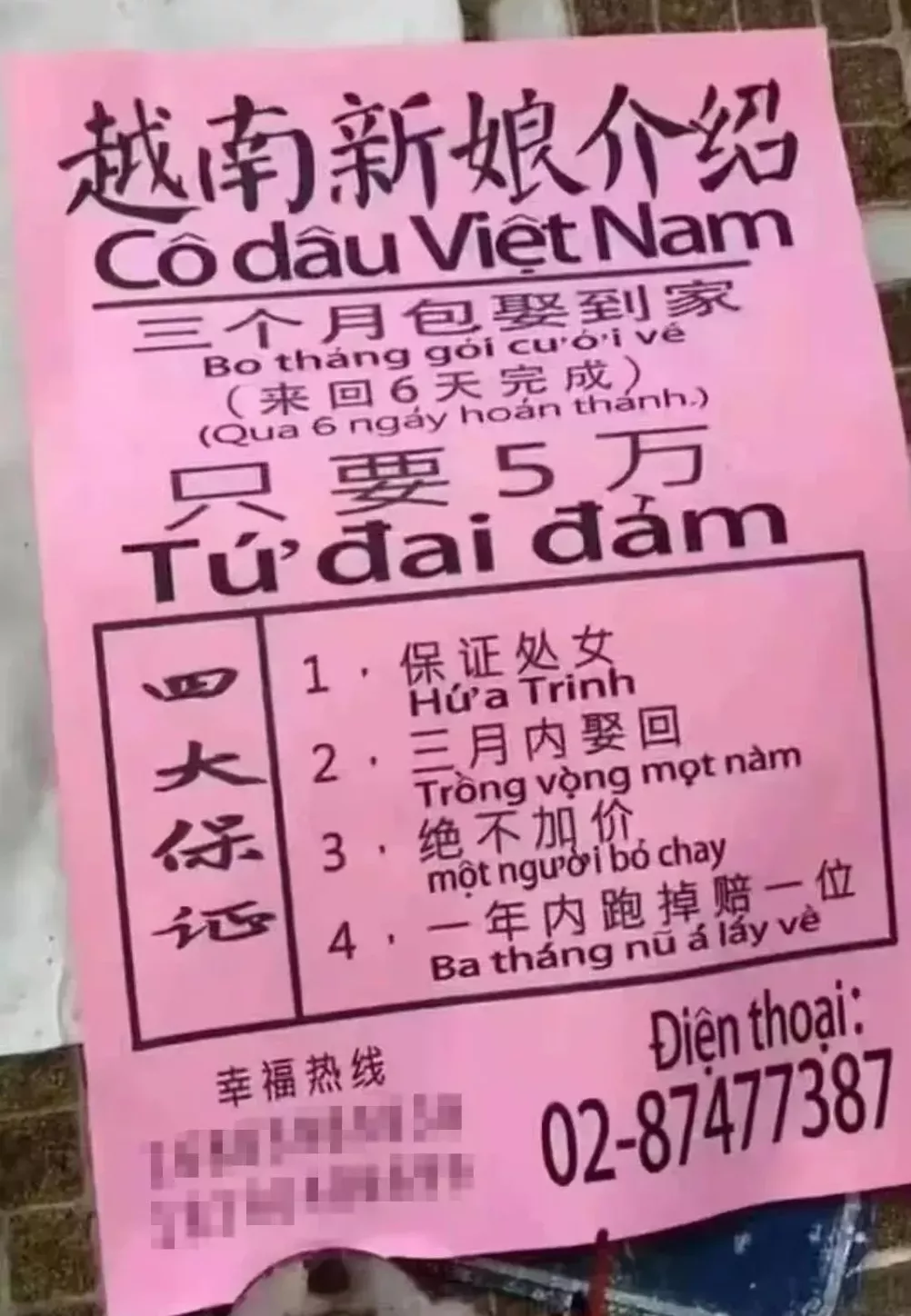 “保證處女,三個月內娶到,來回6天完成,絕不加價,一年內跑掉賠一個”,從頭到腳都是違法的。