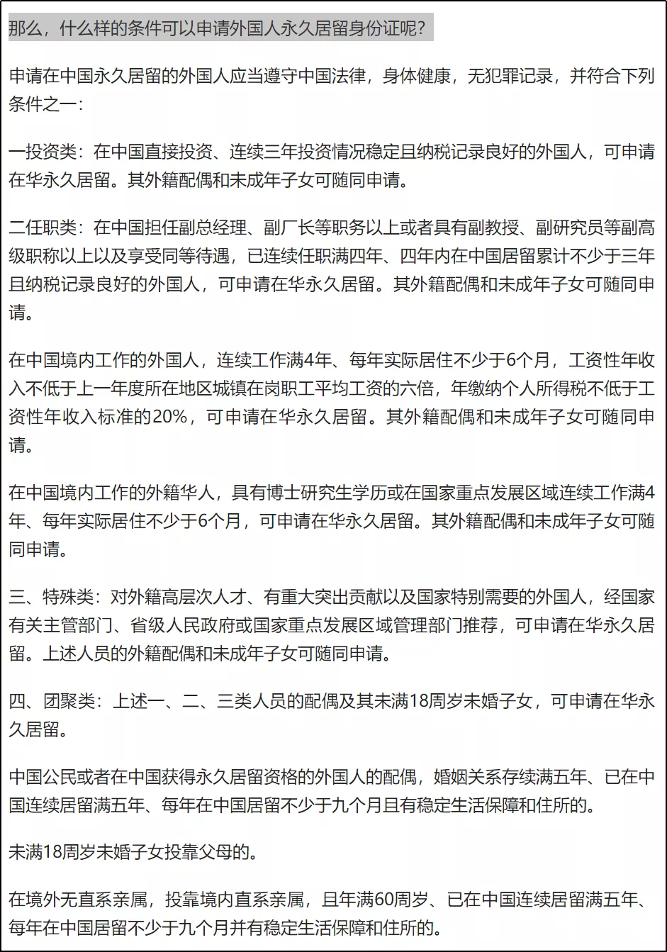 可以説,中國不是隨隨便便就能永久居留的,有條件限制的。