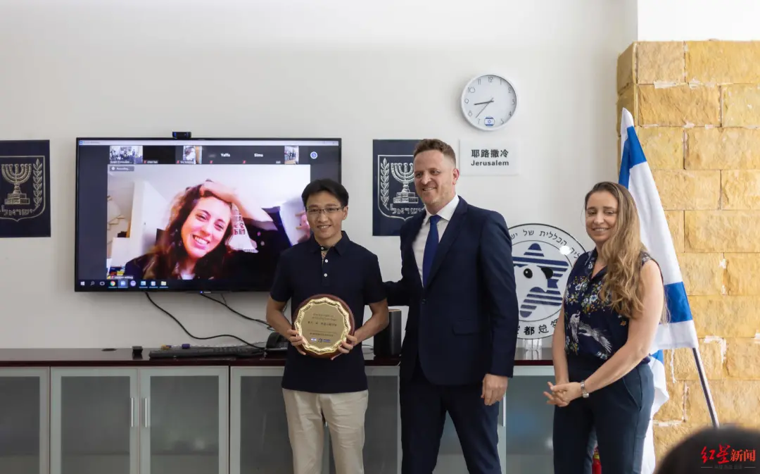 潘立文總領事將一枚金色獎章頒發給蔣偉,以表彰他當年英勇救人的善舉,獎章上用希伯來語和中文刻着一句以色列的俗語: