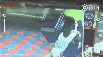 劫匪很沒面子,兇狠地用槍對着老闆娘,威脅對方給錢。老闆娘也沒怕他,反而和劫匪扭打在一起,要去奪劫匪的槍。