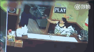 老闆這時候聽到聲音,拿着菜刀就從廚房跑出,三人打作一團。