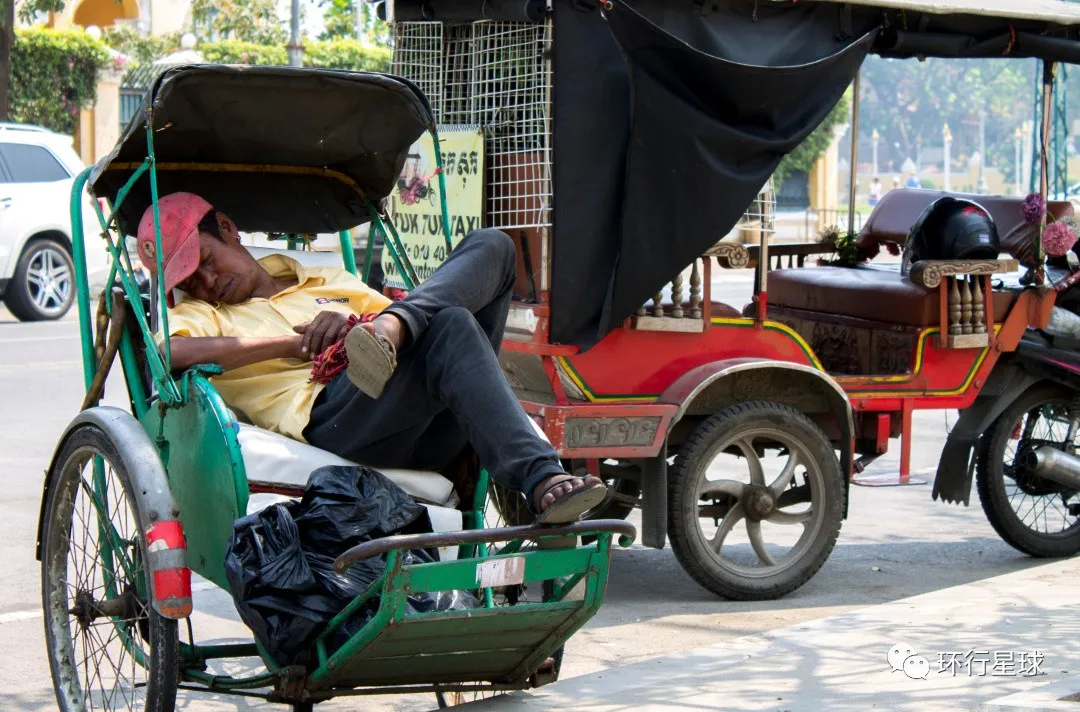 第一次在金邊見到這種車時,我愣住了。車前面躺着一個膀大腰圓的白人,正曬着日光浴,後面是一個瘦骨嶙峋的柬埔寨中老年人在努力蹬着,車行進得很慢很慢。這種輪子很大,依靠司機人力驅動的交通方式,有點像民國時期的黃包車。我一度認為這種交通方式既不便捷,也不人性,所以從未在柬埔寨嘗試過。