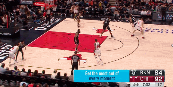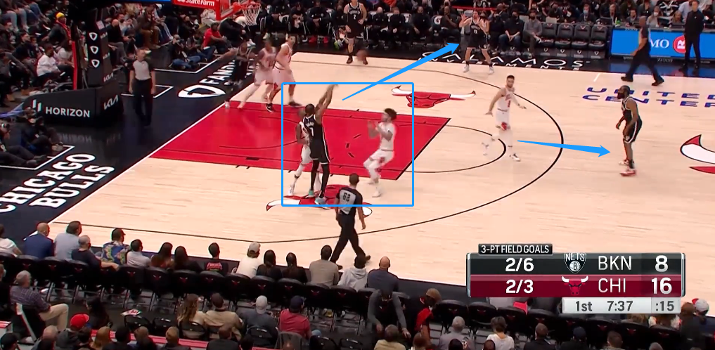 9分17秒,杜蘭特和布朗在右底線附近做了一個無球交叉反跑切到籃下,弧頂的哈登吊傳,杜蘭特接球之後公牛四人回收。杜蘭特→格里芬→喬哈→哈登命中空位三分。