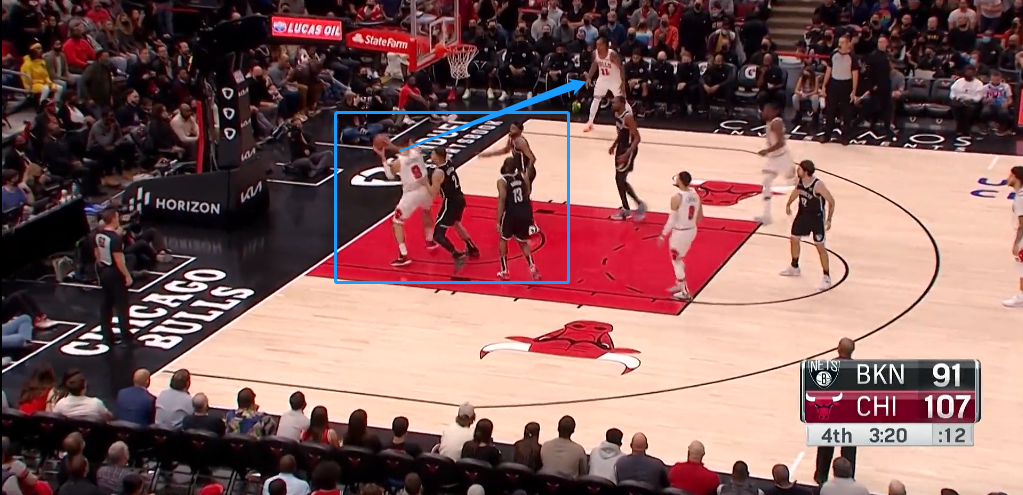 第一節11分08秒,哈登和布朗右路擋拆,德羅贊和球哥選擇夾擊哈登,哈登出球給布朗,籃下有武切維奇鎮守。布朗出球給左底角的格里芬,上線的賈旺特-格林輪轉到底角防格里芬,格里芬再轉給45度的杜蘭特。