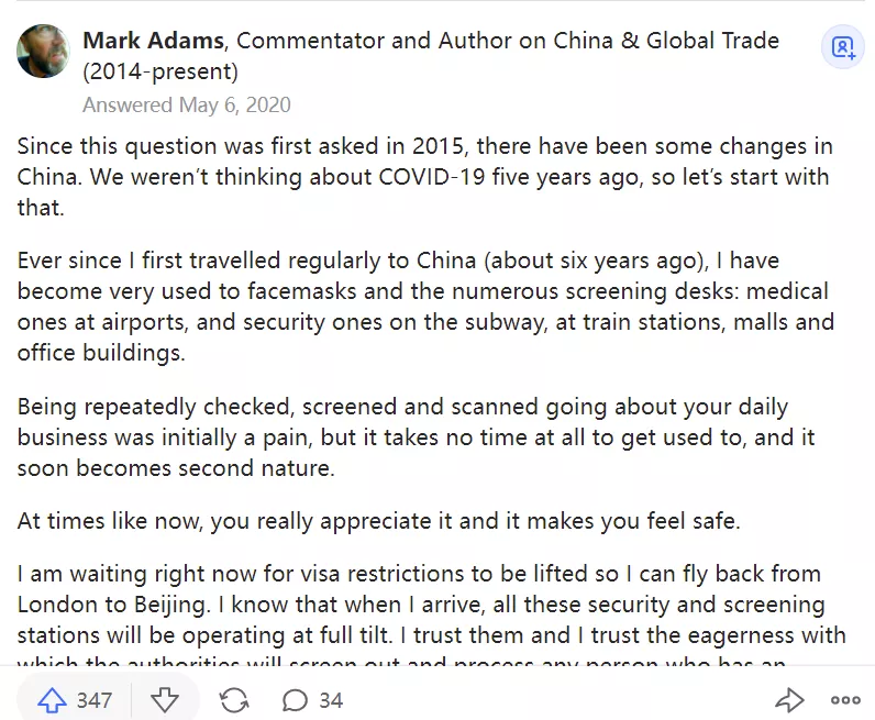 我現在正在等待簽證限制的取消,以便我可以從倫敦飛回北京。我知道,當我到達時,所有這些安全和檢查站將全力運作。我相信他們,我相信當局會急切地篩選和處理任何體温升高或有其他症狀的人。我相信這個系統是有效的,而且只要我沒有新冠的症狀,我知道它將使我受益。(提醒你,如果我確實有新冠的症狀,我可能會發現,在中國,篩查會比我在英國時更快地發現這些症狀,而且我會很快被送去接受良好和有效的治療)。