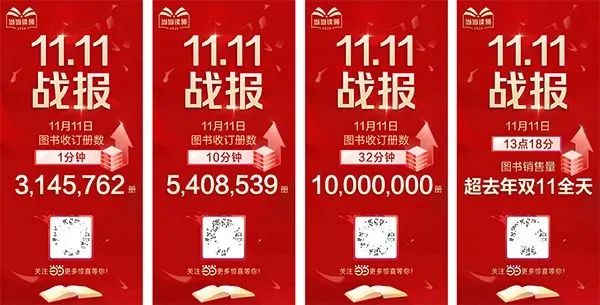 但與此同時,圖書行業也在借電商節之勢實現銷量的大幅增長。以2020年為例,京東進口原版、青春文學、外語學習、法律四個類別的成交額同比增長全部超過100%,噹噹圖書收訂金額同比增長高達219%,雙11當天開局1分鐘就賣出了314萬冊書。