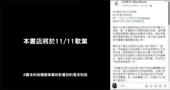 2020年雙11期間,台灣還有40多家獨立書店聯合發起“雙11歇業抗議”,抵制過低的電商折扣,發起者之一紅氣球書店將其稱為“圖書的流血折扣戰”。而台灣圖書電商的促銷力度只是“限時66折”,比起大陸折扣、滿減、優惠券的組合拳像落後了10年。