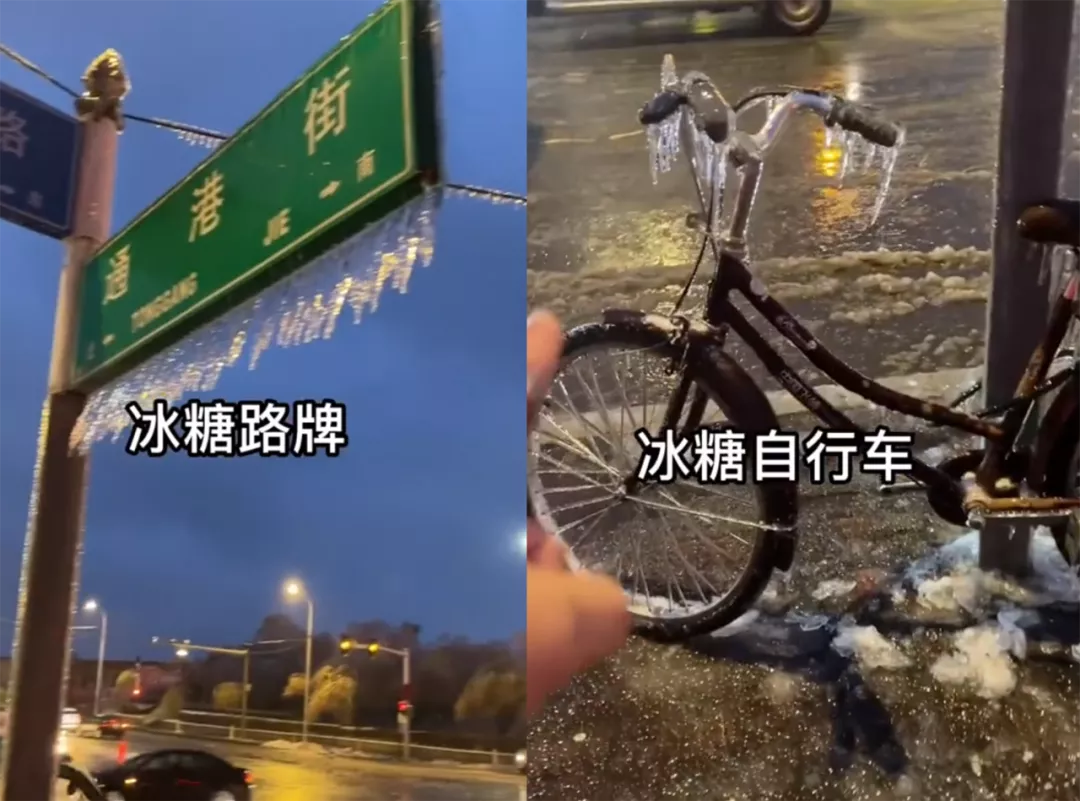 自行車、路燈、大樹……通通都被裹上了一層“冰糖”。