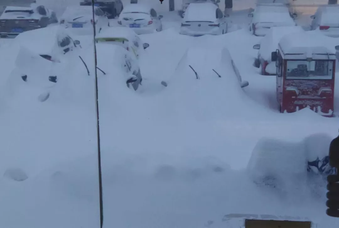 好傢伙,連車都看不見了,停車場徹底變成大雪堆。