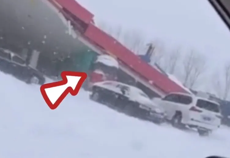 有加油站的罩棚被積雪壓塌,一輛貨車被壓在了底下。