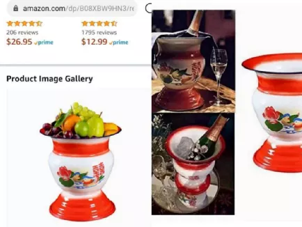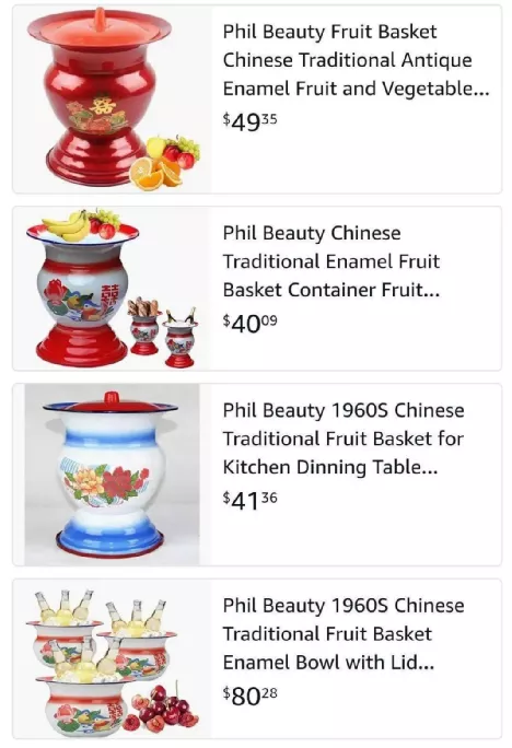 商家的操作也很迷,拿它當果籃、做冰酒器,還在商品描述裏説:“它代表着中國傳統文化,象徵着幸福生活。古色古香的藝術果籃,不僅適合你的房子,也適合喬遷禮物或優雅的婚禮。”