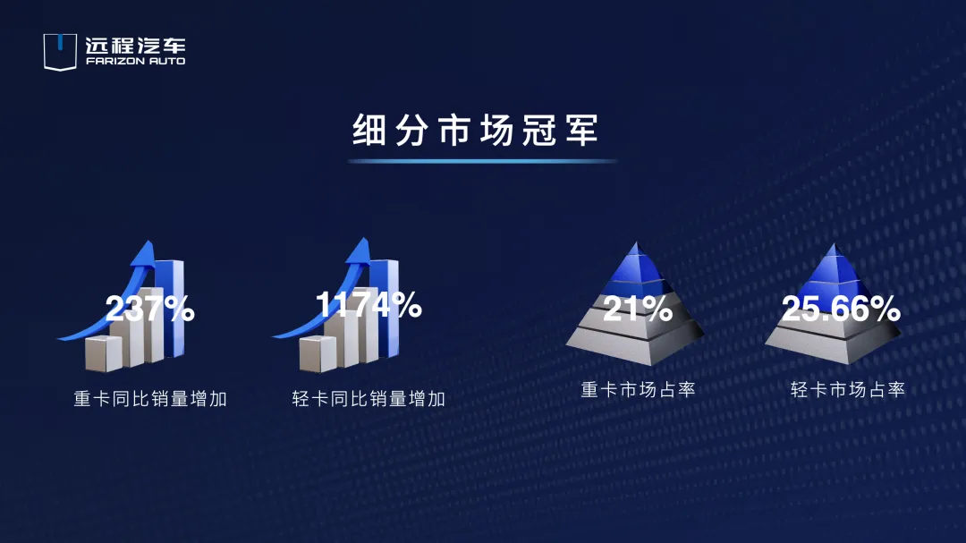 今年1-9月,吉利遠程新能源商用車重卡、輕卡產品同比銷量分別增長237%和1174%,市場佔有率分別達到21%和25.66%,累計銷量奪得細分市場冠軍。