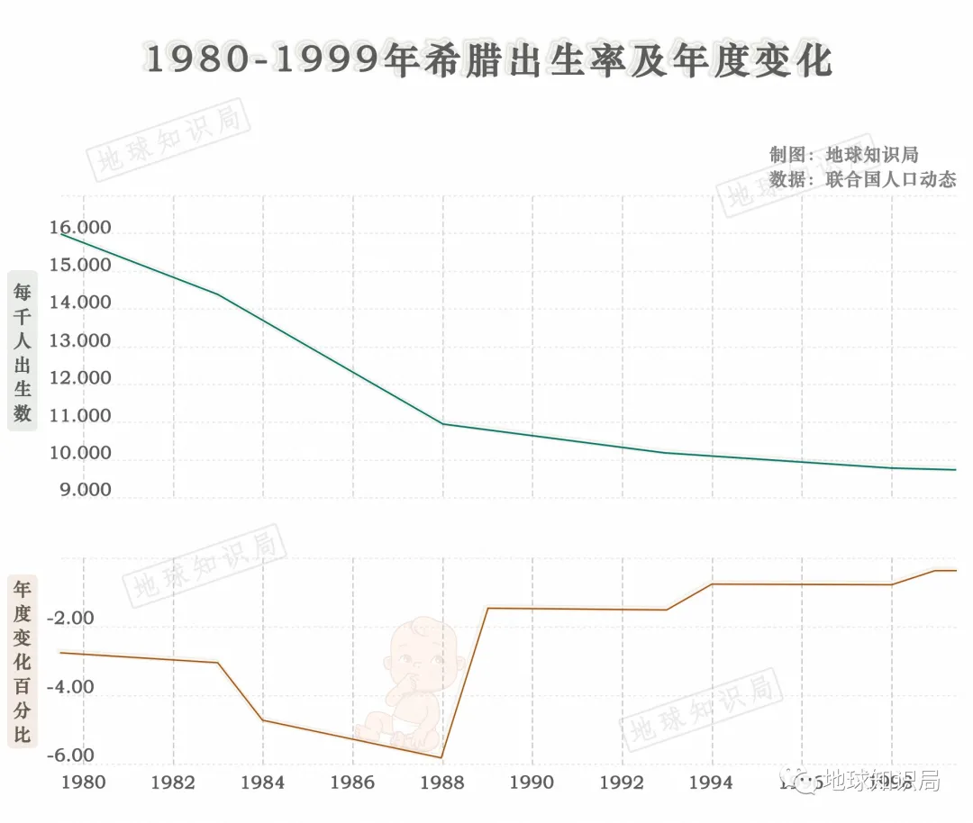 不過,自上世紀80年代末以來,希臘的新生兒數量就一直呈顯著下降趨勢,人口自然增長率也不斷下降。新生兒年出生數量從1980年的14.81萬下降到1999年的10.2萬,這也為新世紀希臘人口紅利的逐漸消退,埋下了伏筆。