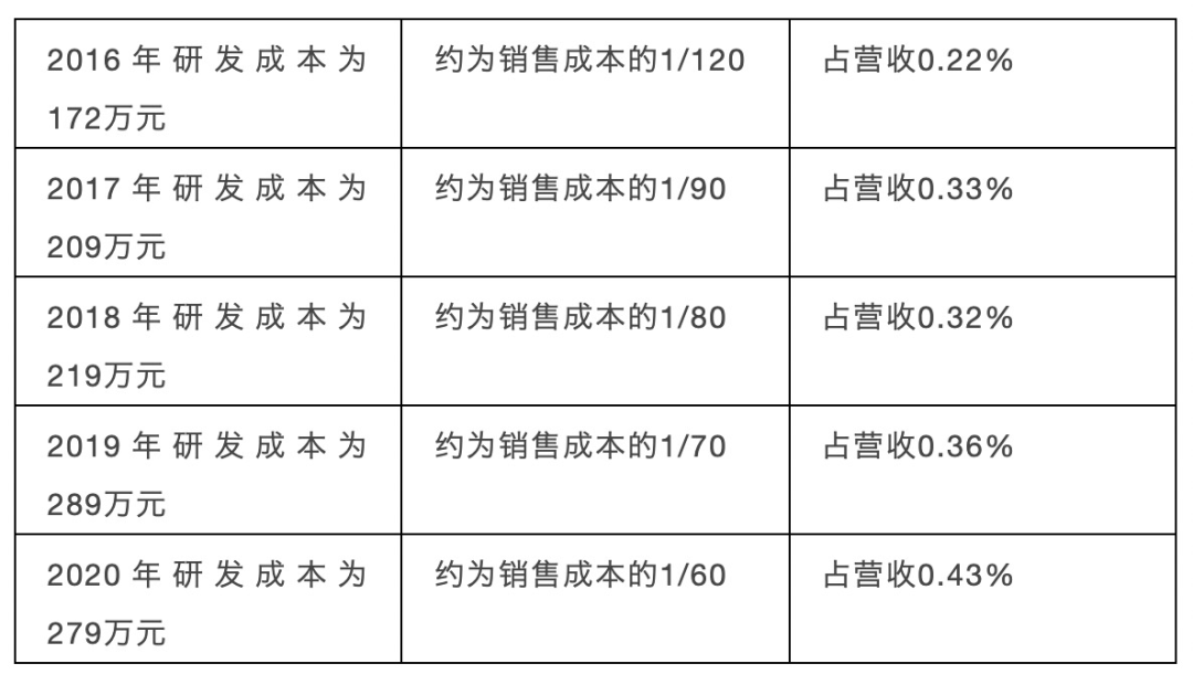 同為A股上市藥企的艾德生物、苑東生物研發投入佔營收總額的17.09%、18.91%,多家A股藥企研發投入佔營收比重超10%,而金嗓子連續多年研發成本佔總營收比不到0.5%。