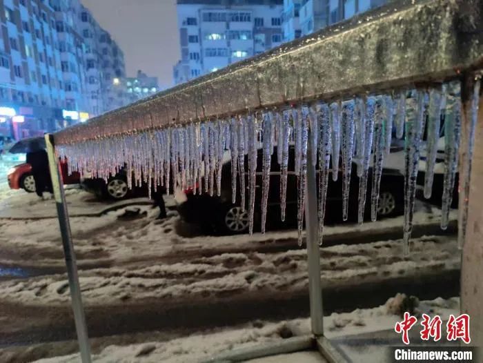 路上的欄杆全部都凍上了冰條,看着就讓人忍不住打哆嗦。