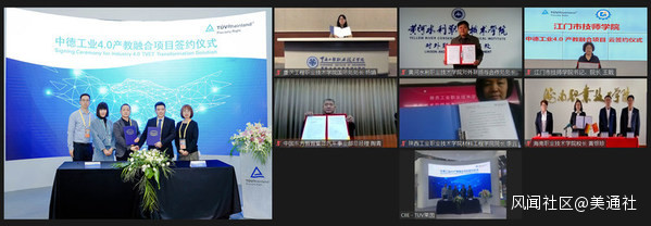 TUV萊茵培訓與諮詢服務總經理陳俊東與深圳信息職業技術學院、重慶工程職業技術學院、黃河水利職業技術學院、陝西工業職業技術學院、海南職業技術學院、江門市技師學院、安徽萬通汽車專修學院在內的7所高校代表舉行了“中德工業4.0 產教融合”項目雲簽約儀式。未來,TUV萊茵培訓與諮詢服務將持續為職業院校提供一站式解決方案,提升國際化產教融合水平,助力中國職業院校的專業建設與質量建設。