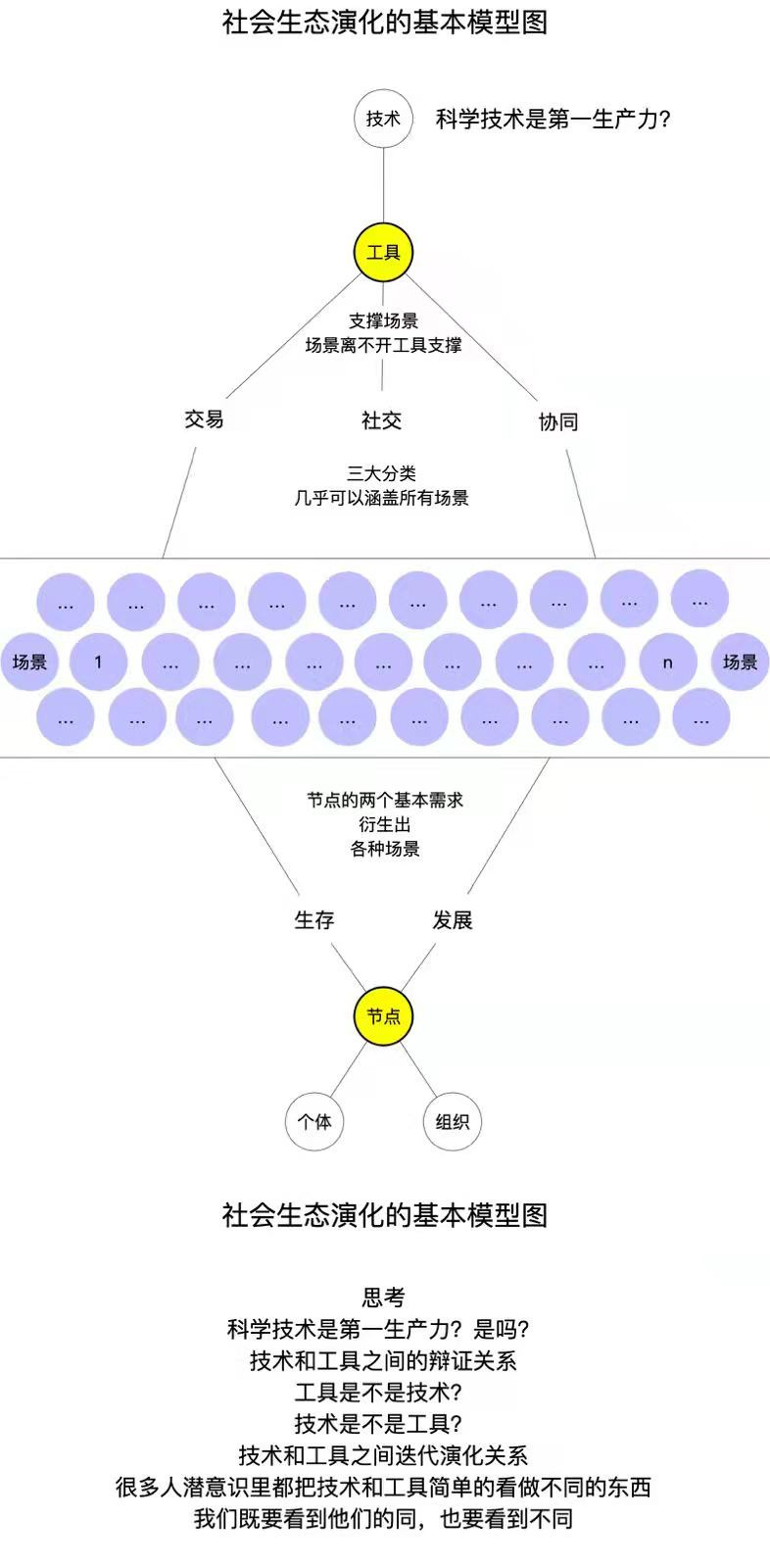 我的成果是《認知與演化》等基礎理論和《社會生態演化模型圖1.0》,如下圖,圍繞節點、場景、工具三個關鍵詞建立的模型。