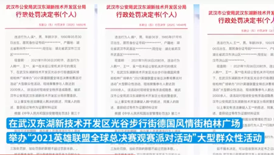 1月6日,湖北武漢光谷步行街直播英雄聯盟S11全球總決賽,超2000人聚集。處罰決定書顯示,三名組織者未經公安機關許可舉辦活動,造成安全隱患,已被行拘。