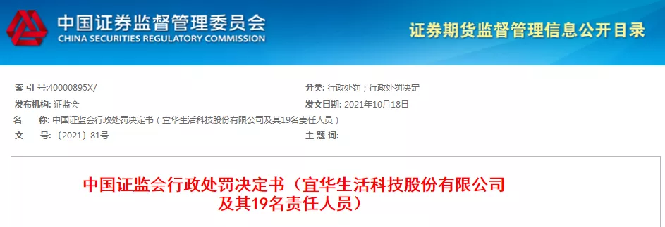 證監會官網8日發佈公告,證監會對宜華生活信息披露違法違規行為進行了立案調查、審理,決定對宜華生活責令改正,給予警告,並處以600萬元的罰款;並分別對實際控制人劉紹喜等19名責任人員給予警告、罰款,全案違法主體被出具合計3885萬元罰單。