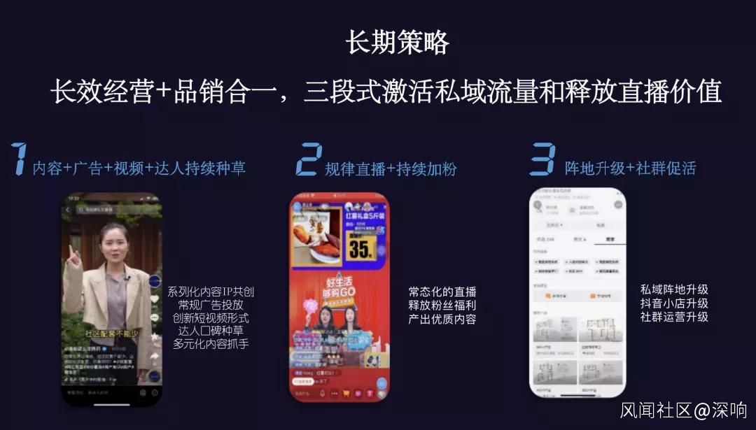 像在6月16日,保利打造的“溜溜節”亦是聯動百城,實現了高效傳播。而在直播的營銷探索中,建業集團則總結出全業態、多品類、跨區域、大聯動的直播策略,並以此為基礎堅持長期經營。其歸納出一套“三段式”方法論:內容+廣告+視頻+達人持續種草;常態化的直播釋放粉絲福利、產出優質內容從而持續加粉;再對私域陣地、抖音小店、社羣運營等進行持續升級,三大板塊螺旋式遞進,確保品銷合一。