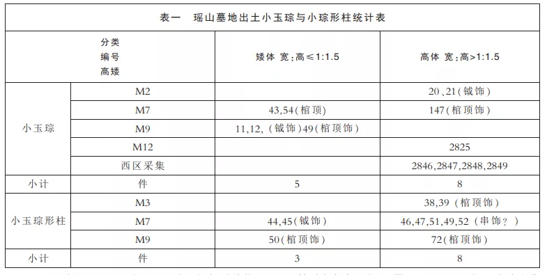 瑤山、反山、匯觀山墓葬中,發現一些琮形小玉柱,三個一組,置於棺頂,這些琮形小玉柱,有可能是死者靈魂出棺通往上界的通天柱。這些棺飾琮形小玉柱,可以作為III式玉琮形態變化的觀念來源。我們根據瑤山墓地出土的琮形小玉柱進行分析,將四隅大於90°者歸類為小琮,將四隅等於90°者歸為小琮形柱;將寬:高≤1:1.5者歸為矮體,將寬:高>1:1.5者歸為高體。根據這樣分類,我們將瑤山墓地出土的小玉琮和琮形柱統計為《表一》,並根據其相關的出土背景關係(M12與西區採集品背景關係信息喪失),大致推斷這些小琮和小柱的用途,結果表明這些小琮和小柱可以用於棺頂飾(通天柱),也可以用作鉞飾,M7的部分小琮形柱還有可能用作串飾,因此沒有一定之規,也難分早晚。因此,我們推測良渚的小玉琮和琮形柱,主要的功能是棺頂飾通天柱,派生功能作為玉鉞冠飾和端飾的綴飾,與串飾配伍是更次要的功能。