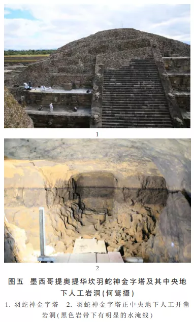 中美洲瑪雅宇宙觀中,將垂直空間分為上、中、下三界。上界稱為“kan”或“chan”,指日月星辰劃過天空所經過的區域,現代天文學稱之為“黃道”。下界被稱為“西巴爾巴”(Xibalba),是一個孕育着生殖力量的潮濕之地,流淌着兩條河流。瑪雅宇宙觀裏平面被視為四方(版塊)——東、西、南、北四方加中心,中心即為宇宙軸,被視為一棵巨大的木棉樹,垂直貫通上、中、下三界,被稱為“世界樹”。三界所釋放的超自然能量,沿着世界樹上下流動;一般死者的靈魂沿着世界樹進入下界,陣亡武士和分娩時死去的婦女靈魂沿着世界樹可升入上界;上界的神靈可應中界人們的乞求,沿着世界樹下降到中界。瑪雅金字塔神廟被視為宇宙山,往往與自然巖洞或人工構建洞室相結合,巖洞和洞室則被視為下界(圖五)。瑪雅人還將大地比喻為原始海洋中游泳的海龜。瑪雅的宇宙觀裏,還有一個非常重要的觀念,就是認為宇宙王國的四角分別由四位帕瓦吞神來支撐。