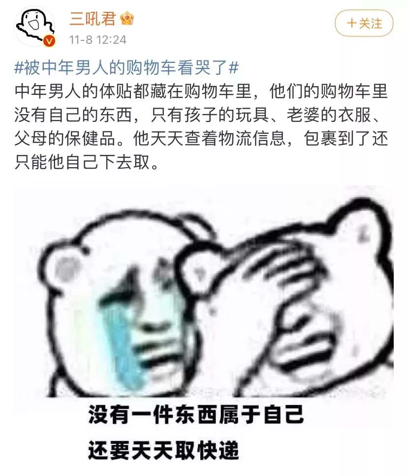所以當我在網上看到一張圖,説中年男人的購物車裏是全家人的東西,他自己的只有一瓶生髮液,結果還得天天對着菜鳥裹裹看物流。