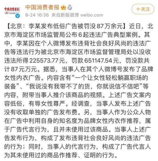 今年8月,脱口秀演員李誕由於代言一則內衣廣告,“一個讓女性輕鬆躺贏職場的裝備”,廣告低俗被北京市海淀區市場監管局沒收違法所得225573.77元,罰款651147.54元,共計87萬餘元。