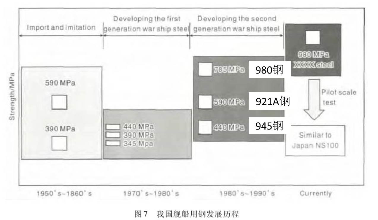 根據2013、14年公開發表的論文,我國實際用於艦艇建造的比較先進的鋼材,主要有用於潛艇的屈服強度785 MPa級980鋼和590 MPa級921A鋼,以及用於水面艦艇建造的921A鋼、440 MPa級945鋼和390 MPa級的907A鋼(這些都是艦艇用鋼的代號,它們都有用合金元素含量表示的國標牌號)。