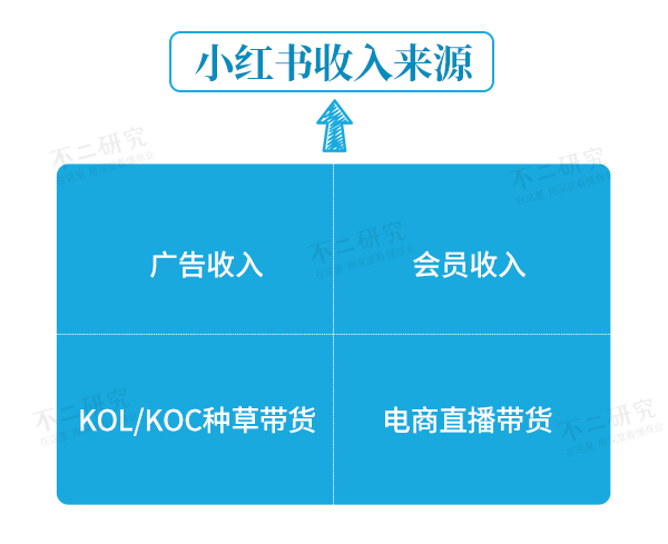 「不二研究」發現,KOL/KOC種草帶貨、會員收入、電商直播帶貨、廣告收入四部分組成了小紅書的營收來源。